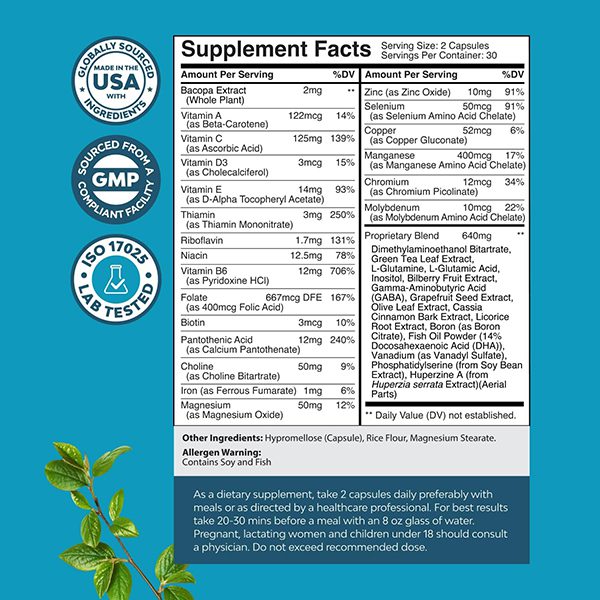 Nootropic Brain Supplement for Memory and Focus Support – Vitamins for Mental Support & Clarity with Bacopa Monnieri, VIT A, B6, Riboflavin, Niacin, Thiamin & Folate – Cognitive Complex